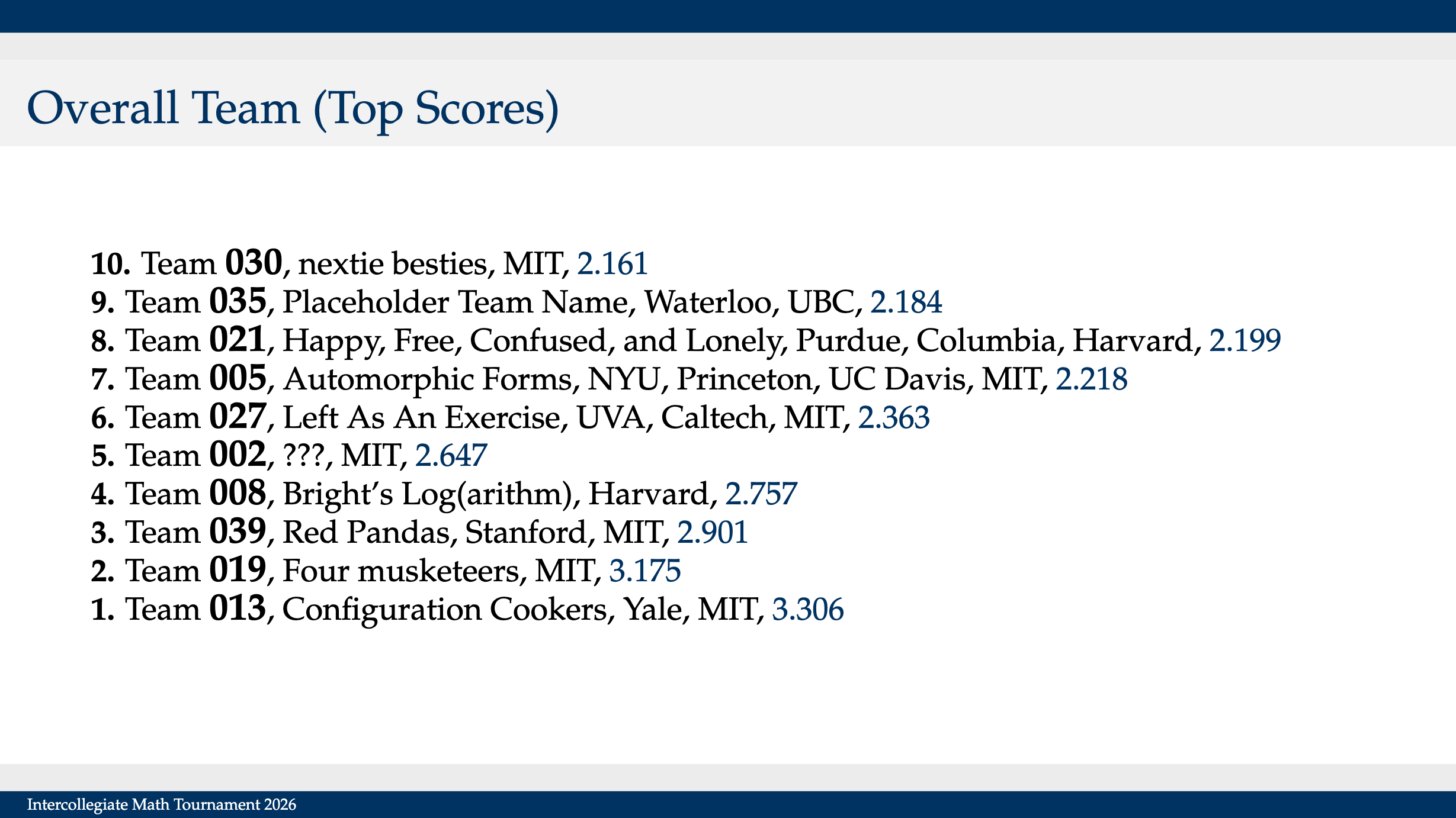Despite the poor individual round we ended up in the top 10 teams overall. We prided ourselves in being the best team with no member from Harvard or MIT.