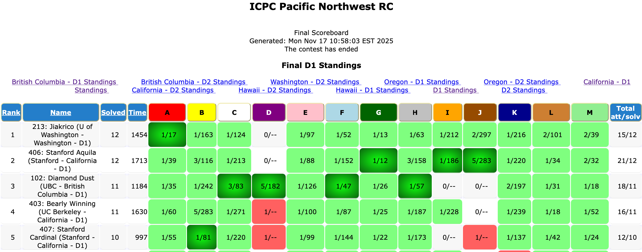 Later, Alex also got stuck on M’s implementation. Thankfully, at least Rain had no issues. For teams around the World Finals cutoff, the bottleneck was solving A, a medium-hard problem, and then solving at least one of the hard problems C, D, J. Almost no one solved B, G, L.